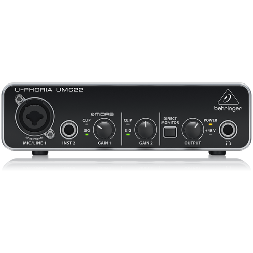 2×2 аудиоинтерфейс UMC 22 из серии U-Phoria от компании Behringer предназначен для подключения к компьютеру по протоколу USB и оснащен одним микрофонным предусилителем MIDAS с 48 В фантомного питания.