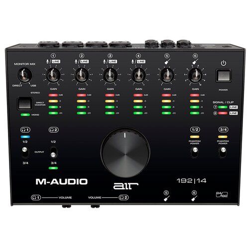 M-Audio AIR 192 | 14 – это профессиональный USB-аудиоинтерфейс, являющийся флагманской моделью в линейке AIR, которая включает в себя доступные и эффективные звуковые карты для небольших студий звукозаписи или же для домашнего использования. Как и в младших версиях, здесь установлены 24-битные АЦ/ЦА-конверторы, способные работать в частотах дискретизации до 192 кГц, что позволяет записывать и воспроизводить звук в наиболее высоком качестве, доступном на данный момент.