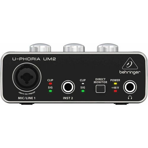 Behringer UM2 - это аудио-интерфейс 2x2 серии U-Phoria. Устройство предназначается для подключения по протоколу USB к персональному компьютеру. Оно оснащено микрофонными предусилителями XENYX с 48 В фантомного питания.