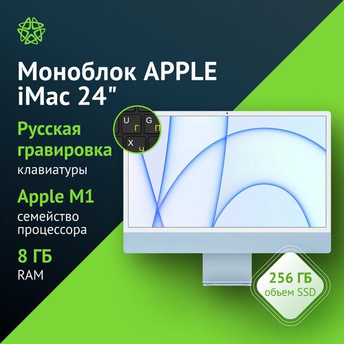 Моноблок Apple iMac A2438, macOS, процессор Apple M1 8 core 3.2ГГц, память 8ГБ DDR4, накопитель SSD 256Gb, видеокарта Apple, диагональ 24", разрешение 4480x2520, WiFi, BT, в комплекте клавиатура + мышь, синий (MGPK3C/A)