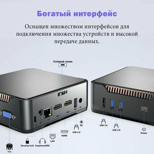 - Поддержка двух HDMI и одного VGA монитора, вывод на 3 экрана (клонирование или продление рабочего стола)
