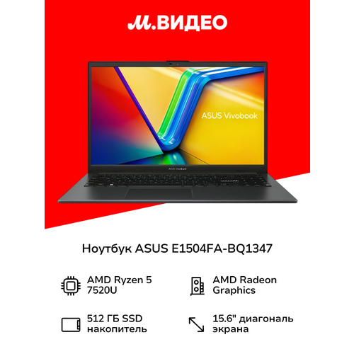 Ноутбук Asus E1504FA-BQ1347 Mixed Black - компактная и легкая модель в пластиковом корпусе весом всего 1,63 кг, что делает ее удобным вариантом для студентов или служащих, которые часто ездят в командировки. • Основные характеристики Лэптоп получил четырехъядерный процессор AMD Ryzen 5 7520U частотой 2,8 ГГц, которая может при пиковых нагрузках увеличиваться до 4,3 ГГц, и 8 Гб оперативной памяти LPDDR5. • SSD объемом 512 Гб Твердотельный накопитель обеспечивает тихую работу и быструю загрузку системы, позволяет устанавливать значительное количество программ и хранить множество фотографий, видеороликов, фильмов, различных документов и прочего. • IPS-экран диагональю 15,6 дюйма Обладает разрешением 1920x1080 пикселей, отличается высокой яркостью, контрастностью и точностью цветопередачи. Частота обновления 60 Гц отвечает за плавность картинки и вполне комфортна для решения повседневных задач и офисной работы. За выход в интернет отвечает встроенный модуль Wi-Fi. Интегрированы выход HDMI, порты USB 2.0 Type-A, USB 3.2 Type-A, USB 3.2 Type-C и 3,5-миллиметровый разъем для подключения наушников или микрофона.