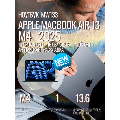 13.6" Ноутбук Apple MacBook Air 13 2025 , Apple M4, RAM 16 ГБ, SSD 512 ГБ, Apple graphics 10-core, macOS, MW133, midnight , английская раскладка