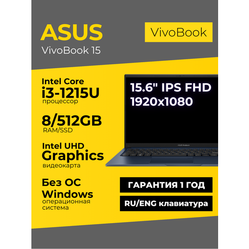 Найти - Ноутбук Asus Vivobook 15 15.6 IPS FHD i3-1215U 8ГБ 512ГБ UHD Graphics Синий Без ОС