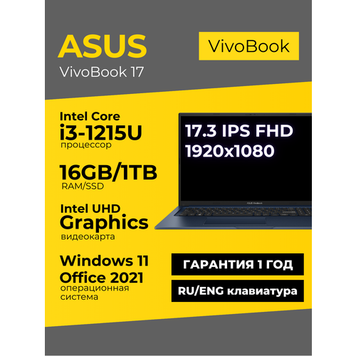 Найти - Ноутбук Asus Vivobook 17 17.3 IPS FHD i3-1215U 16ГБ 1ТБ UHD Graphics Синий Windows 11+Office 2021