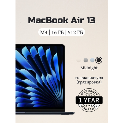 Найти - Apple MacBook Ноутбук Air 13 M4, RAM 16 ГБ, SSD 512 ГБ, MacOS, MW133, Midnight