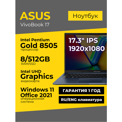 Найти - Ноутбук Asus Vivobook 17 17.3 IPS 1920x1080 Intel Pentium 8505 8ГБ 512ГБ UHD Graphics Синий Windows 11+Office 2021