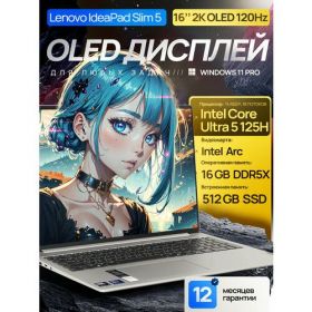 Найти - 16 Ноутбук Lenovo IdeaPad Slim 5 OLED, 2K (2048x1280), 120Hz, 130% sRGB, Intel Core Ultra 5 125H (14 ядер, до 4.5 ГГц), Intel Arc Graphic RAM 16 ГБ LPDDR5X (7467 МГц), SSD 512 ГБ, Windows 11 Pro + Office 2021 Pro Plus, Алюминий, Русская раскладка