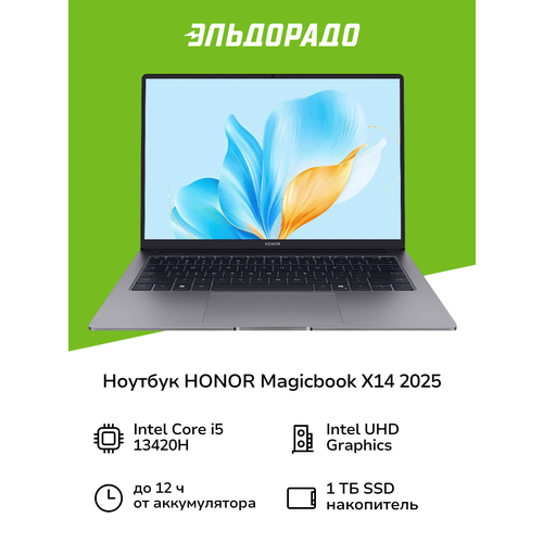 Ноутбук HONOR Magicbook X14 2025/14"/Core i5 13420H/16/1 Tb/Win11/Серый (5301ALWJ) - компактная модель с экраном диагональю 14 дюймов (35,5 см) разрешением 1920x1200 пикселей. В основе - матрица IPS, которая отличается естественной цветопередачей и высокой яркостью. Частота обновления - 60 Гц. Ноутбук поставляется с операционной системой Windows 11 Home.