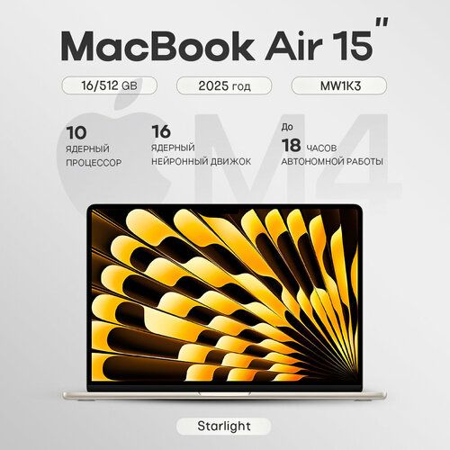 Найти - Ноутбук Apple MacBook Air 15 2025 M4 16/512GB Starlight (MW1K3), русская раскладка (гравировка)
