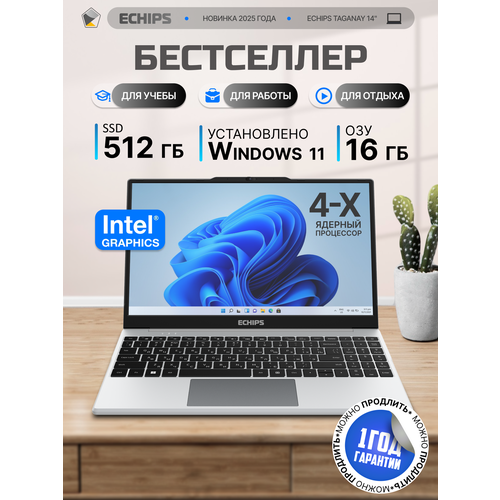 Найти - Ноутбук для работы и учебы 14 Echips Taganay, Intel Celeron N5095, RAM 16 ГБ, SSD 512 ГБ, Intel UHD Graphics, Windows Home, серый, русская раскладка