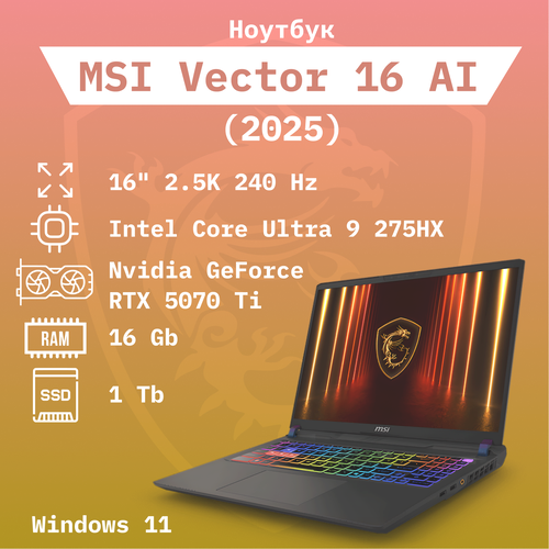 Найти - Ноутбук MSI Vector 16 AI 2025/Ultra 9-275HX/RTX 5070 Ti 12 Gb/16 2.5K 240Hz/16 Gb + 1 Tb/Win 11/ Клавиатура RU