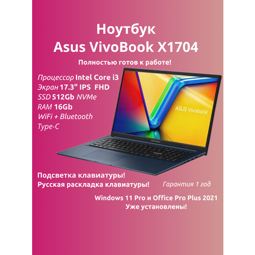 Ноутбук ASUS Vivobook 17 X1704ZA (Intel Core i3-1215U до 4.4Ghz 6 ядер/17.3" FHD IPS матовый/1920х1080/RAM 16GB/512GB SSD NVMe/Intel UHD Graphics/Windows 11 Pro) Цвет: Quiet Blue. Подсветка клавиатуры.