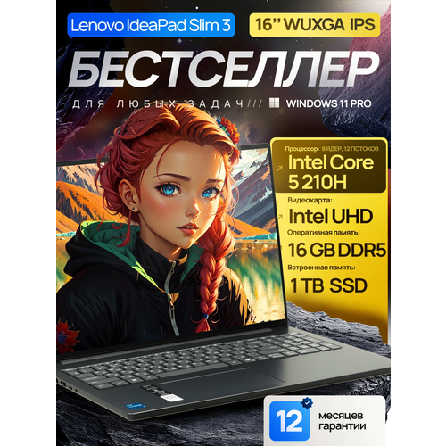 Найти - 16 Ноутбук Lenovo IdeaPad Slim 3i Gen 10, IPS WUXGA, Intel Core 5 210H (4.8 ГГц), RAM 16 ГБ LPDDR5 (4800 Mhz), SSD 1 ТБ, Intel UHD Graphics, Windows 11 Pro + Microsoft Office 2021, Grey, Русская раскладка, Металлическая крышка