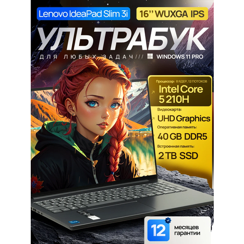 Найти - 16 Ноутбук Lenovo IdeaPad Slim 3i Gen 10, IPS WUXGA, Intel Core 5 210H (4.8 ГГц), RAM 40 ГБ LPDDR5 (4800 Mhz), SSD 2 ТБ, Intel UHD Graphics, Windows 11 Pro + Microsoft Office 2021, Grey, Русская раскладка, Металлическая крышка