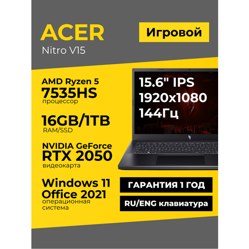 Найти - Игровой ноутбук Acer Nitro V15 15.6 IPS FHD Ryzen 5 7535HS 16ГБ 1ТБ GeForce RTX 2050 Черный Windows 11+Office 2021