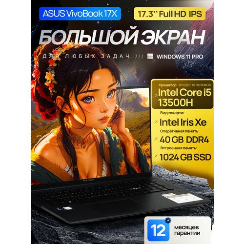 17.3" Ноутбук ASUS VivoBook 17X, IPS, Intel Core i5-13500H (12 ядер), RAM 40 ГБ, SSD 1 ТБ, Intel Iris Xe Graphics G7, Windows 11 + Office 2021, Русская раскладка