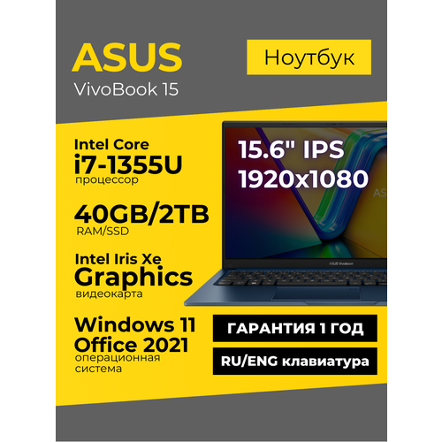 Найти - Ноутбук Asus Vivobook 15 15.6 IPS FHD i7-1355U 40ГБ 2ТБ Intel Iris Xe Graphics Синий Windows 11+Office 2021