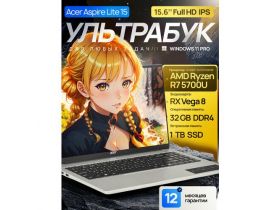 15.6 Ноутбук Acer Aspire Lite 15, AMD Ryzen 7 5700U (8 Ядер, до 4.3 ГГц), RAM 32 ГБ DDR4, SSD 1 ТБ, AMD Radeon Vega RX 8, Windows 11 Pro + Office 2021 Pro Plus, Pure Silver, Русская раскладка, EAC 4635463754