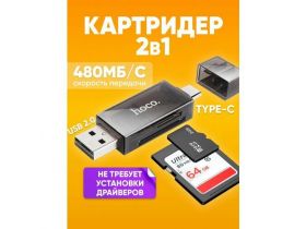 Картридер HOCO dhd01 Type-C-USB 2.0, прозрачный / Переходник для карт памяти SD/ TF для ПК ноутбука, черный / Адаптер USB type-C 480 мб/с Plug&Play, карты до 2ТБ 102940040985