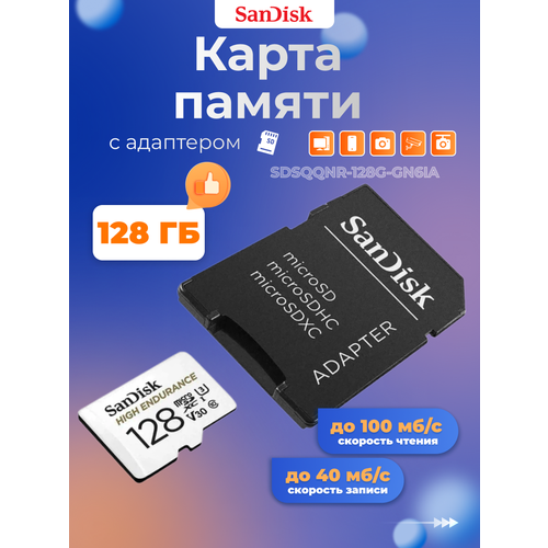 Карта памяти microSD 128 ГБ SanDisk Class 10 High Endurance Video SDSQQNR-128G-GN6IA без адаптера . Эта карта расширяет способность памяти многофункциональных мобильных телефонов, цифровых камер, карманных компьютеров и других портативных устройств, поддерживающих данный формат, и класс карт. Идеально подходит для записи любых видов данных. Сохраните больше своих собственных коллекций музыки, видеороликов, кинофильмов, рингтонов, картин и фотографий.
