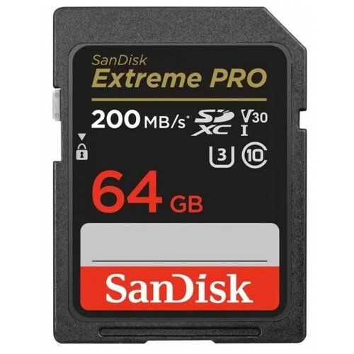 Карта памяти Extreme PRO UHS-I SDXC 64 ГБ, 200 Мбит/с от SanDisk имеет емкость 64 ГБ, совместима с шиной UHS-I и имеет класс скорости V30, что обеспечивает минимальную скорость записи 30 МБ/с. Он предназначен для устройств SD, которые могут снимать видео в форматах Full HD, 3D и 4K, а также необработанные и серийные фотографии.