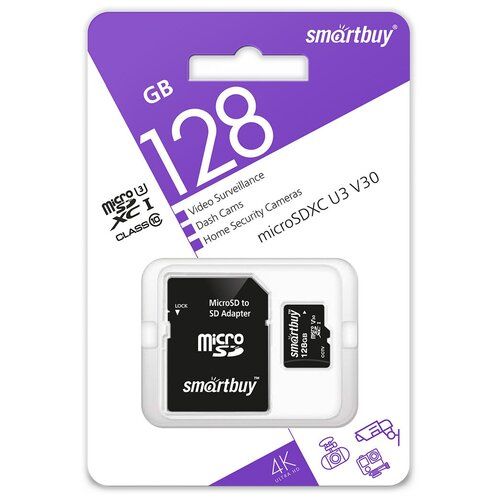 Найти - Micro SDXC карта памяти Smartbuy 128GB cl10 U3 V30 для видеонаблюдения (с адаптером SD)