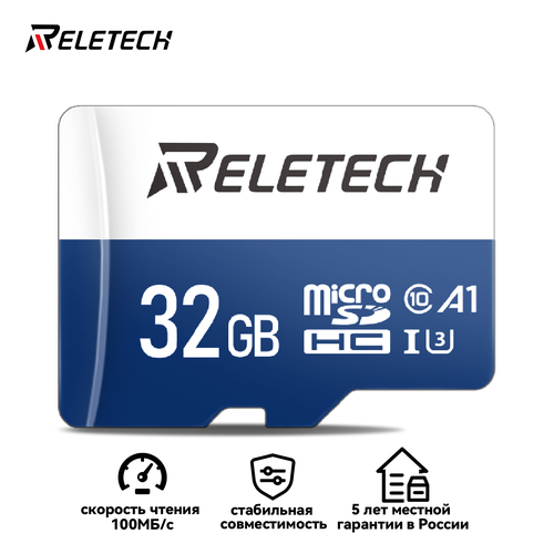 Найти - Карта памяти Reletech micro SD A1 32ГБ Для Цифровая камера, камера наблюдения, дрон, регистратор вождения, синий и белый