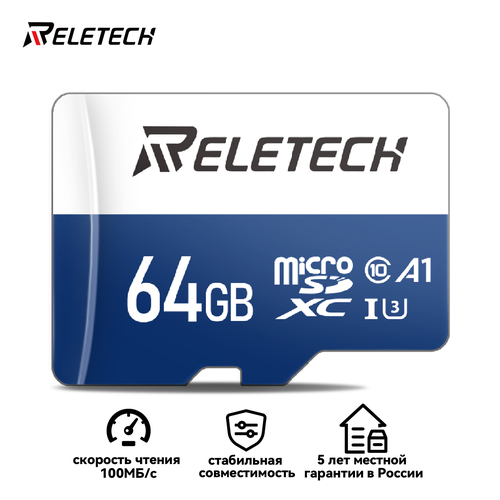 Найти - Карта памяти Reletech micro SD A1 64ГБ Для Цифровая камера, камера наблюдения, дрон, регистратор вождения, синий и белый