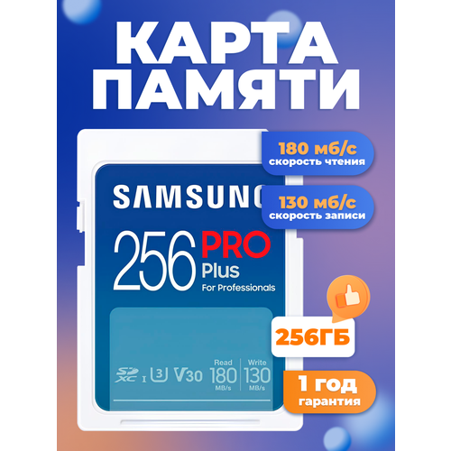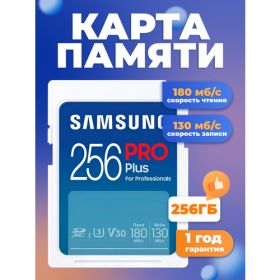 Карта памяти PRO Plus UHS-I от Samsung, разработанная для фотографов и других специалистов в области цифровых медиа, емкостью 256 ГБ и использует преимущества шины UHS-I для поддержки скорости чтения до 180 МБ/с и скорости записи до 130 МБ/с