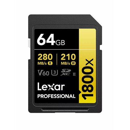 Профессиональная карта памяти UHS-II SDXC емкостью 64 ГБ 1800x (серия GOLD) от Lexar имеет емкость 64 ГБ и использует преимущества шины UHS-II для поддержки расширенных функций цифровых зеркальных камер, таких как непрерывная серия затворов и быстрая съемка, а также съемка в формате RAW и JPEG. Эта карта также хорошо подходит для захвата видео, включая видео 4K, 3D и Full HD, и может достигать максимальной скорости чтения до 280 МБ/с и максимальной скорости записи до 210 МБ/с. Благодаря классу скорости V60 минимальная скорость записи гарантированно не опускается ниже 60 МБ/с.