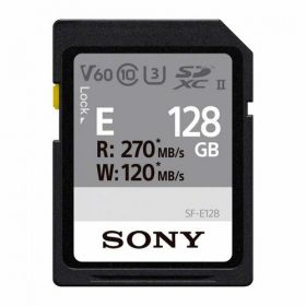 Карта памяти SDXC UHS-II серии SF-E емкостью 128 ГБ. Максимальная скорость чтения / записи составляет 270 / 100 Мбайт/с соответственно (по данным внутреннего тестирования Sony). Класс скорости V60 означает, что гарантируется минимальная постоянная скорость 60 Мбайт/с вплоть до полного заполнения памяти, что позволяет записывать видео с битрейтом до 480 Мбит/с, не опасаясь внезапной остановки в процессе записи. Карта хорошо подходит для фотографов, снимающих длинные серии кадров в JPEG или RAW, а также для записи видео с разрешением 4K / 6K, в том числе с высокой частотой кадров.