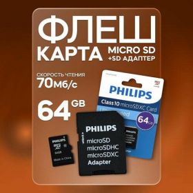 Найти - Карта памяти micro SD 64GB PHILIPS PHILIPS Class 10 с SD адаптером