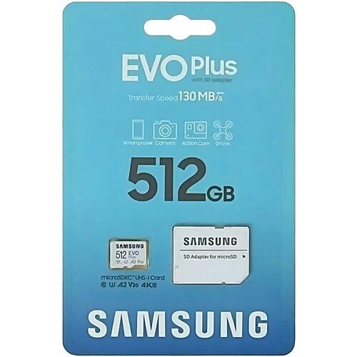 Samsung EVO Plus 512GB microSDXC UHS-I (MB-MC512SA/CN) - карта памяти с внушительной емкостью 512 ГБ. Позволяет существенно расширить хранилище в смартфоне, планшетном компьютере и других устройствах. Она выполнена в форм-факторе microSDXC и соответствует классу скорости V30, демонстрируя показатели до 130 Мбайт/с в режиме чтения и записи. Карта памяти Samsung EVO Plus имеет защищенную конструкцию, благодаря чему гарантирует бесперебойную работу на протяжении длительной эксплуатации. Адаптер SD в комплекте позволяет расширить совместимость запоминающего устройства.