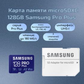 Найти - Карта памяти Samsung Pro Plus microSDXC 128GB Class 10, V30, A2, UHS-I U3, R 180 МБ/с, адаптер на SD