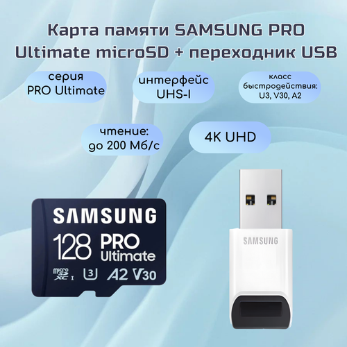 Найти - Карта памяти Samsung Pro Ultimate microSDXC 128GB Class 10, V30, A2, UHS-I U3, R 200 МБ/с, с переходником на USB