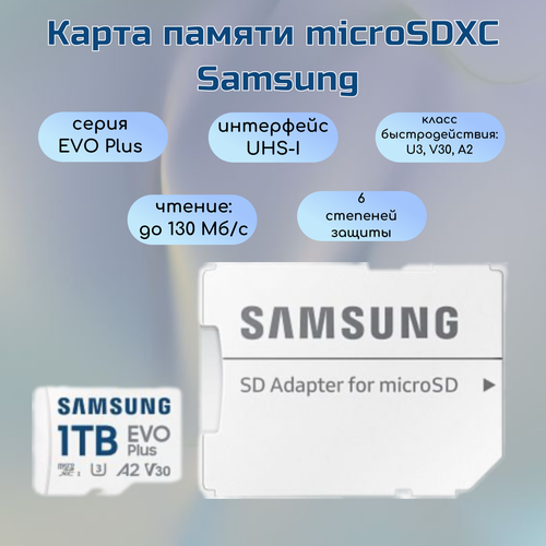 Найти - Карта памяти Samsung Evo Plus microSDXC 1ТБ Class 10, V30, A2, UHS-I U3, R 130 МБ/с, адаптер на SD