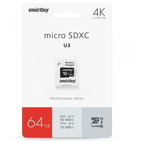 Карта памяти SmartBuy microSDXC 64 ГБ Class 10, UHS-I U3, R/W 90/70 МБ/с, адаптер на SD, 1 шт., черный