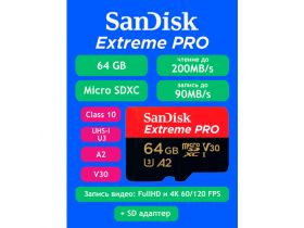 Карта памяти MicroSD 64Gb SanDisk Extreme Pro microSDXC Class 10 UHS-I V30 A2 200MB/s + SD adapter 4487008413