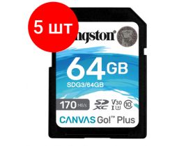 Комплект 5 штук, Карта памяти Kingston Canvas Go Plus SDXC UHS-I Cl10, SDG3/64Gb 102652828300