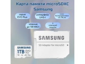 Карта памяти Samsung Evo Plus microSDXC 1ТБ Class 10, V30, A2, UHS-I U3, R 130 МБ/с, адаптер на SD 103732847818