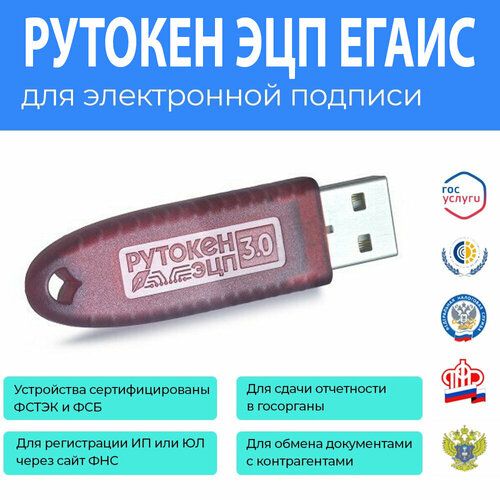 Активные ключевые носители Рутокен ЭЦП 3.0 — принципиально новая линейка USB-токенов для подписания документов электронной подписью и строгой двухфакторной аутентификации. Продукты линейки являются полнофункциональными аппаратными СКЗИ. Данная модель пришла на смену Рутокен ЭЦП 2.0 который снят с производства. В USB-токенах аппаратно реализованы: ГОСТ Р 34.10–2012 с длиной ключа 256/512 бит и ГОСТ Р 34.11–2012, а также симметричные шифры Магма и Кузнечик и международные алгоритмы электронной подписи RSA и ECDSA. Криптографические операции выполняются без копирования ключа в память компьютера. Поддержка отечественных и международных стандартов позволяет использовать модели Рутокен ЭЦП 3.0 в информационных системах с высокими требованиями безопасности. ПО Рутокен работает во всех современных настольных и мобильных операционных системах. USB-токен Рутокен ЭЦП 3.0, подключенный к USB-порту, работает везде, где поддерживается Рутокен ЭЦП 2.0 (в том числе в ЕГАИС). Дополнительные настройки не требуются. При этом существенно повышена производительность криптографических и файловых операций. Устройства Рутокен ЭЦП 3.0 сертифицированы по требованиям ФСТЭК. Подходят для получения квалифицированных сертификатов в УЦ ФНС и ЕГАИС