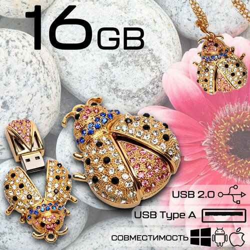 Флешка выполнена в виде жука, украшенного стразами, что делает ее не только функциональной, но и красивой. Золотистый цвет корпуса придает ей изысканный вид, а стразы добавляют блеска и роскоши.