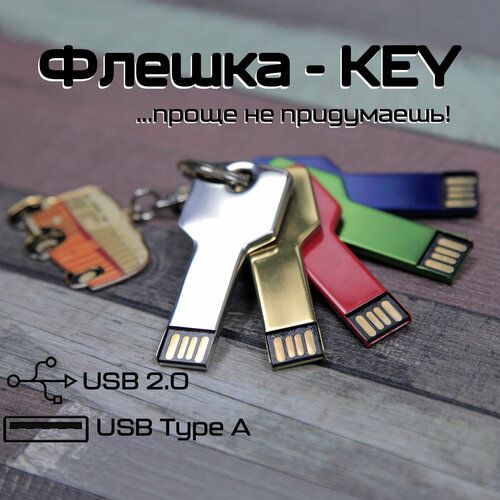 Флешка имеет нестандартный дизайн в виде ключа, что делает ее уникальной и запоминающейся.