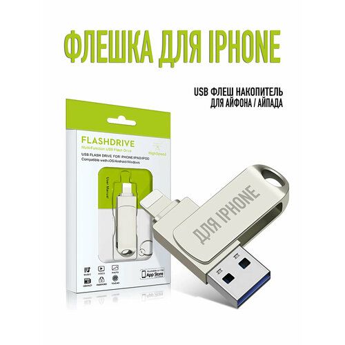 Флешка для iPhone и iPad с возможностью быстрой передачи данных на ноутбук или компьютер. С одной стороны USB разъем для подключения к любому ПК, а с другой - разъем lightning, который подходит к любому айфону и айпаду, начиная с 5й модели 2012 года выпуска и для iphone 14 включительно. USB флеш накопитель 2 в 1 : одна сторона с разъемом lightning для подключения к айфону или айпаду, а вторая сторона - стандартный ЮСБ вход, для подключения к стационарному компьютеру или ноутбуку.