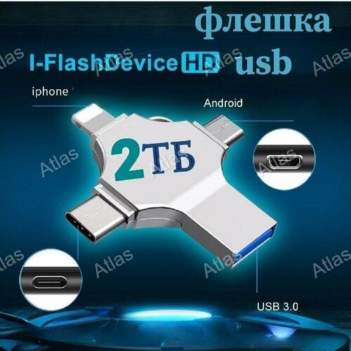 Флеш накопитель - это удобное скоростное устройство для хранения и передачи данных. Наша универсальная модель в форме креста с высокой ёмкостью 2ТБ имеет 4 актуальных разъема Lightning, Type-C, Micro USB и USB, делая его идеальным выбором для каждого пользователя. Корпус ударопрочен, выполнен из алюминиевого сплава. На флешкарте есть небольшое ушко в которое при желании можно вставить ремешок и использовать как брелок. Высокоскоростной флеш-накопитель совместим с различными устройствами - компьютерами, мобильными телефонами и даже заменит флешку на iPhone. Такой аксессуар станет незаменимым дополнением к Вашему ноутбуку, а также будет отличным расширением памяти на айфоне или андроиде. С помощью такой портативной флешки появится возможность хранить фотографии, видео, музыку в одном месте. Флешка 2ТБ поддерживает файлы и фото в разных форматах.
