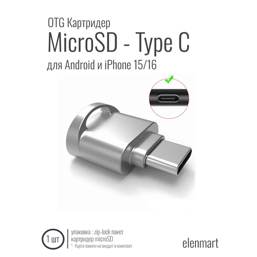 OTG картридер с интерфейсом USB Type-C и слотом для карт памяти microSD. Подходит для Apple iPhone 15, Apple iPhone 16 и Android смартфонов Samsung, Huawei, Oppo, Honor, Motorola, и других, также любой другой технике, которая оснащена разъемом Type-C.