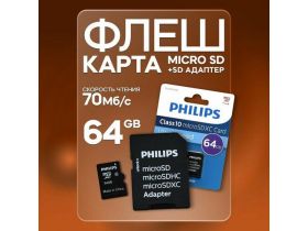Карта памяти micro SD 64GB PHILIPS PHILIPS Class 10 с SD адаптером 103671253448