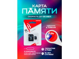 Карта памяти SmartBuy microSDHC 8 ГБ Class 10, V10, A1, R/W 23/17 МБ/с, адаптер на SD, RU, 1 шт. 101282627869