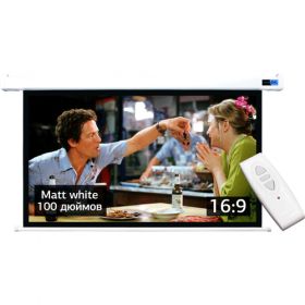 Экран имеет соотношение сторон 16:9, что делает его подходящим для домашнего кинотеатра. Матовый белый цвет полотна обеспечивает высокое качество изображения и отличный угол обзора.